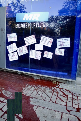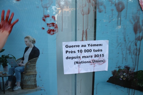 Une dizaine de citoyens concernés, du collectif "Désarmez !" ont projeté ce matin de la peinture rouge symbolisant le sang versé par les victimes Yéménites sur les vitres du bureau du Mouvement réformateur, ils y ont également apposé des messages détournant le slogan du parti. Par cette action ils ont pointé du doigt la responsablité du MR dans la guerre au Yémen face à son refus de mettre un terme à la vente d'armes vers l'Arabie Saoudite.
