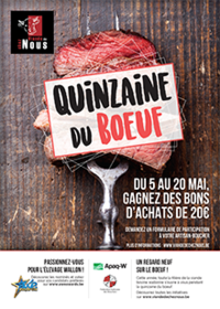 En collaboration avec la Fédération Nationale des Bouchers Charcutiers et la Fédération HoReCa Wallonie, la 3ème édition de la Quinzaine du Bœuf a été lancée. Près de 500 artisans bouchers et 31 chefs s'apprêtent à décliner les diverses races de bœuf (Blanc Bleu Belge, Limousine, Charolaise, Blonde d’Aquitaine...), sous toutes ses coutures : onglet, paleron, entrecôte, faux filet, rumsteack… La diversité de la production wallonne tant en termes de race que de goût est une fierté pour notre agriculture.