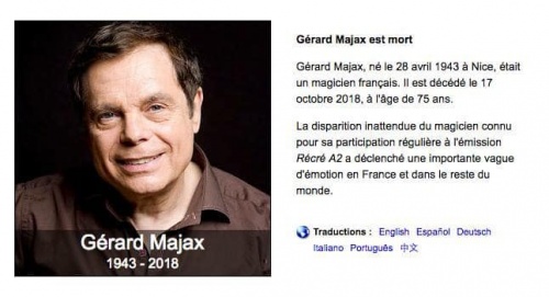 Vers midi ce mardi 16 octobre 2018 un communiqué a annoncé le décès de Gérard Majax, le prestidigitateur préféré des Français (depuis le décès de Garcimore…).