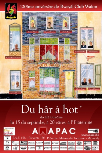 L’année 2018 consacre le 120ème anniversaire du Royal Club Wallon de Malmedy. Alors que les activités « habituelles » de cette vénérable association occupent une large place dans le calendrier malmédien ( bal des enfants, « Size du Noé », les séances de « Cak'tèdjes »,… ), ses membres se sont chargés de commémorer cette étape mémorable par d’autres organisations de circonstance telles la rencontre au monument Pietkin à Sourbrodt, la vente d’un calendrier très coloré, l’organisation de trois conférences traitant l’une de la médecine populaire, l’autre du passé très disputé de notre région, et la troisième programmée pour le 26 octobre abordera “La mémoire de la Seconde Guerre mondiale de 1945 à nos jours” ( par Justine Remacle ),Dans un avenir très proche, des acteurs / trices régionaux monteront sur les planches pour présenter une pièce écrite et mise en scène par Manfred Siquet ( Fré Guyôme ) qui est un des piliers du Club Wallon, et qui a été assisté par Marie-Claire Buchholz et Jacky Lodomez, ainsi que d’autres acteurs qui ont accepté de relever ce pari. Des remerciements s’adressent à l’asbl Amapac et en particulier à son président Freddy Lodomez, qui a apporté son aidé dans cette aventure, à Manfred Dahmen ainsi qu’à Monique Marsden-Lebrun.