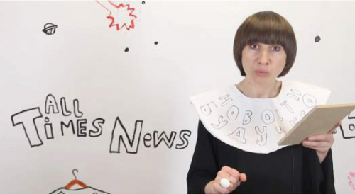 Alevtina Kakhidze a envoyé des messages par trois canaux vidéo à partir du pavillon VDNKh pendant la Biennale de Moscou. A midi, le Future News parlait uniquement de prévisions. Dans l’après-midi, Present News se penchait sur ce qui se produisaient au VDNKh. Le Past News du soir était basé sur un texte à propos de Strawberry Andreevna, qui vit à Zhdanovka, une petite ville au nord-est de Donetsk où plusieurs batailles ont été livrées pendant la guerre en 2014.