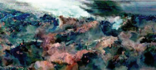 Empruntant à la technique du datamoshing, l’artiste rend les images digitales instables jusqu’à l’apparition de paysages abstraits.