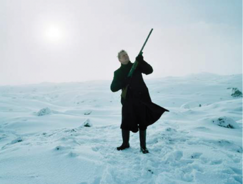 Guilt Trip met en scène le comédien islandais Laddi vêtu de noir et se promenant dans un sublime désert enneigé rappelant l’oeuvre de Caspar David Friedrich - sauf que ses bottes continuent de se coincer et qu’il tire avec son arme à plusieurs reprises sans jamais atteindre sa cible. C’est un essai subtil sur la psychologie insaisissable de Laddi et un portrait tragicomique de la défaite et du défi.
