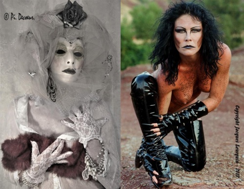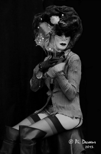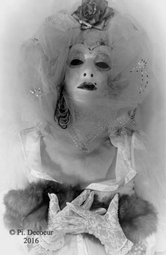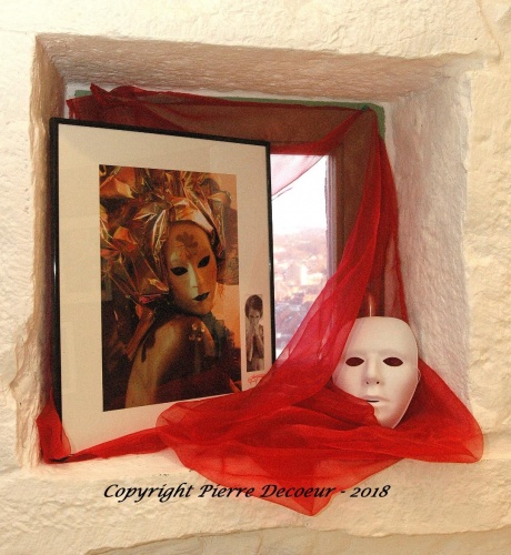 Quant aux masques de Pierre Decoeur, ils n’évoquent absolument pas ceux de Venise, mais relèvent de l’intérêt que l’artiste leur porte, lui qui acheta nombre de masques à l’état brut, ensuite peints, décorés et habillés, avec goût, par l’intéressé, qui les fit porter par de ravissants mannequins, dont on ne peut apercevoir du visage que leur « Regards masqués », Pierre Decoeur nous confiant que l’un de ses grands pères, ainsi que sa propre mère étaient photographes, alors qu’étant encore enfant, il aimait également la peinture… Ainsi naquit sa vocation et son goût de composer des photographies scénographiées aux accents d’authentiques peintures…