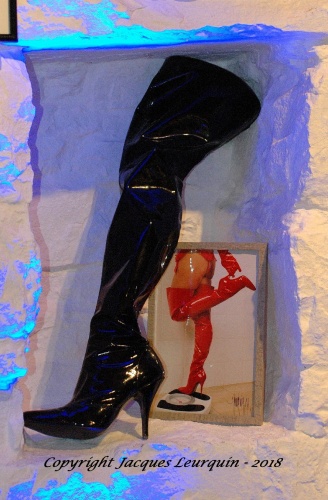Ainsi, nous voyons des bottes en cuir, tantôt rouges, tantôt noires, l’unebien réelle, d’autres photographiées, porteuses d’un serpent ou marchant sur des pièces automobiles, à moins que l’on ne découvre des ailes blanches portées par un mannequin « live » faisant face à un mannequin d’étalage aux ailes noires moins sages…