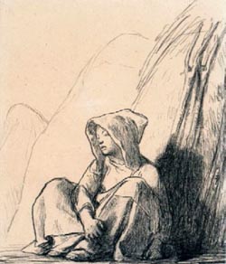 “L’art de Millet est un art de l’observation et de la mémoire. Millet regarde, observe, observe encore et laisse les images s’imprégner en lui avant de les traduire par le crayon, sur le papier, ou par le pinceau, sur la toile. Dans ce travail, le quotidien tient une place privilégiée. Millet observe, sans les déranger et comme à distance, les jeunes-filles qu’il voit se baigner, sommeiller, tricoter, innocentes, belles, naturelles. Il aime, aussi, peindre les femmes, mères et épouses, occupées aux tâches traditionnelles de la maison. Elles filent, font le pain, nourrissent l’enfant, les enfants. Ces peintures, très éloignées des grandes figures héroïques du monde paysan, sont pour le peintre Millet l’occasion de s’exercer à ce qu’il appelle sa ‘manière hollandaise’, une manière de transposer, dans le monde rural du 19ème siècle, la peinture de genre hollandais du 17ème siècle, que l’on redécouvre alors en France” (extrait du catalogue).