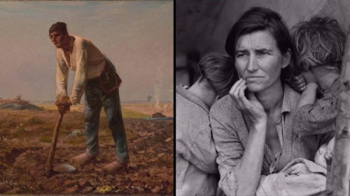 Aussi, la peinture choisie pour l’affiche de la présente rétrospective, “L’Homme à la Houe (1860-1862) constitue l’archétype du paysan normand du 19ème siècle, mais aussi du pionnier ayant raversé l’Atlantique pour s’établir en territoire inconnu, aux Etats-Unis, alors même que la photo (1935) due à l’Américaine Dorothea Lange (1895-1965), retenue pour celle de l’expo “Millet USA”, nous présente une paysane, probablement émmigrée, avec deux de ses sept enfants.