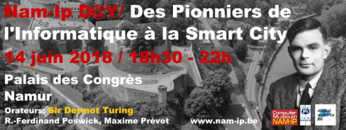 Ce dernier 14 juin, au « Palais des Congrès », à Namur, le « Computer Museum NAM-IP » organisait, sous le titre « Des Pionniers de l’Informatique à la Smart City », une rencontre avec Sir John Dermot Turing, neveu d’Alan Mathison Turing (1912–1954), venu spécialement du Royaume-Uni, à l’occasion de cette soirée, le frère Réginald-Ferdinand Poswick, de l’abbaye St.-Benoît de Maredsous, et Maxime Prévot, le Bourgmestre de Namur.