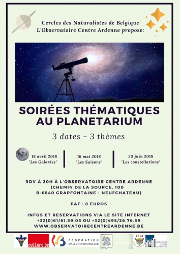 Les Cercles des Naturalistes de Belgique et l'Observatoire Centre Ardenne vous proposent ses prochains événements: Séances publiques de Planetarium avec 3 dates pour 3 thèmes: