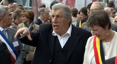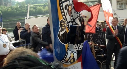 Ce saxophone étant caché par une toile, il intrigue tous les passants, alors que les discours officiels sont prononcés, en présence du Gouverneur de la Province, Denis Mathen, et de différents Maires et Bourgmestres, par le Ministre-Président de la Wallonie, Willy Borsu, le représentant du Ministre régional du Tourisme, René Collin, et, bien sûr, d'un Bourgmestre de Dinant comblé, Richard Fournaux. Vient, enfin, la prise de parole de l'invité du jour, Vladimir Cosma, qui revint en quelques mots sur sa brillante carrière lui qui nous confia avoir quitté son pays natal, la Roumanie, ses compositions musicales ayant été, à l'époque, considérées, selon ses propres mots, comme "décadentes" (sic) ! Tout au contraire, il souligna son attachement à la Belgique, où il trouve que le public est moins "froid" (sic) qu'en France, aimant se rappeler d'avoir collaboré, tant avec Toots  Thielemans (né Jean-Baptiste Thielemans/1922-2016), dans un genre musical qu'il apprécie particulièrement, le jazz, aussi bien qu'avec Plastic Bertrand (né Roger Jouret).
