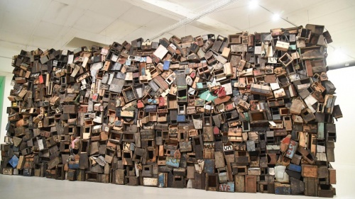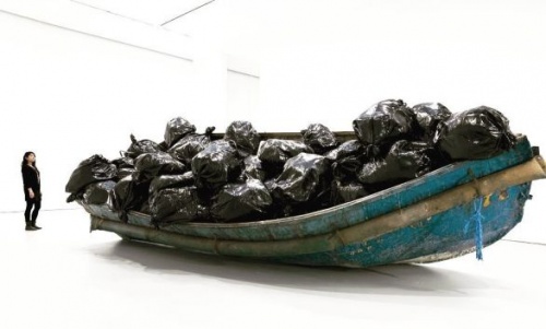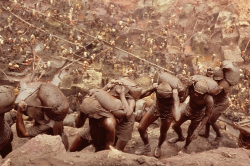« vaisseau amiral » de l’organisation. Entre autres, notons la présence d’un mur de boîtes en bois (qui étaient utilisées par les cireurs de chaussures latinos) ; des photographies, grands-formats, du travail dans les mines brésiliennes (d’un panoramique sur des milliers de fourmis humaines grouillant au bas de la mine, jusqu’au gros plan d’un mineur au visage noirçi) ; d’une installation évoquant le premier pas de l’homme sur la lune ; d’une autre installation, avec une authentique embarcation pour réfugiés ; … ; … ; …