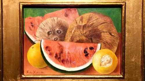 d’ « Eldorado », de sa célèbre épouse Frida Kahlo (1907-1954), qui dévoile les… larmes d’une noix de coco, semblant se référer à la fin de vie douloureuse de l’artiste, qui, pour raisons médicales, ne pouvait plus réaliser que des tableaux de petits-formats.