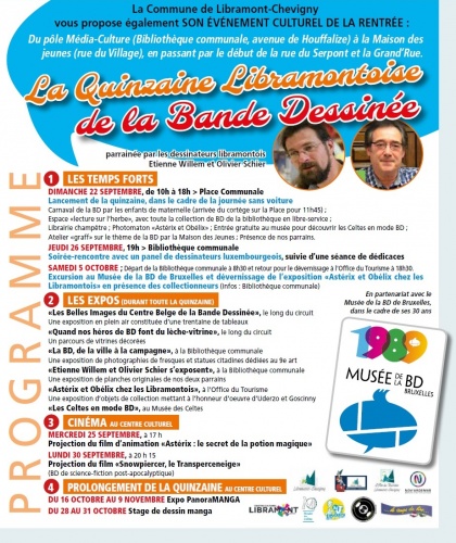 Carnaval de la BD par les enfants de maternelle (arrivée du cortège sur la place à 11h45), espace "Lecture sur l'herbe" avec toute la collection de BD de la bibliothèque en libre-service, librairie champêtre par "Le temps de Lire" et photomaton "Astérix et Obélix", entrée gratuite au musée pour découvrir les Celtes en mode BD, présence de nos parrains.