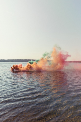L’utilisation du fumigène est sans doute née de l’intérêt que l’artiste porte aux questions de société. Utilisés généralement lors de manifestations, les fumigènes évoquent les mouvements de masse, le bruit et parfois même la violence. Dans les photographies de Minelli, cet outil d’urgence qu’est le fumigène est détourné de sa fonction première.