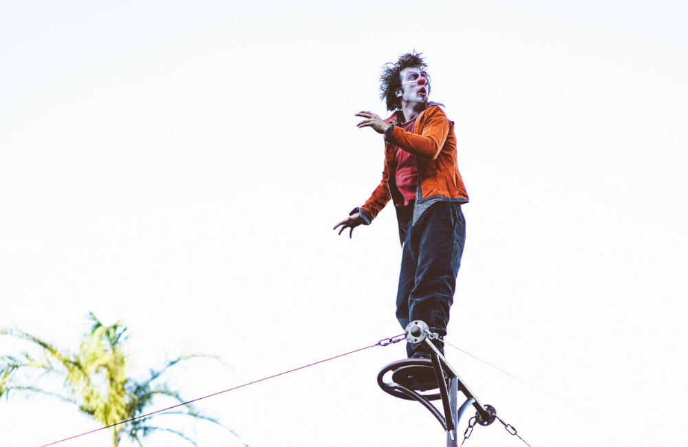 Synopsis : « Questionner la vie sur terre depuis les airs, c’est ce que vous propose un clown acrobate, au mât chinois et aux questions existentielles, dans une performance composée d’acrobatie, de musique et de philosophie. Accompagné d’un musicien aux pieds sur terre, ce clown tendre et rock’n’roll prend de la hauteur, effrayé par le brouhaha du monde, pour chercher désespérément. Mais attention, comme l’archet sur les cordes, parfois ça crisse, ça grince et ça explose … »