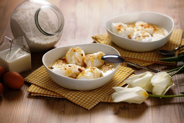 5/ Versez la crème refroidie dans un plat, posez délicatement les îles dessus. Parsemez-les d’amandes torréfiées.
