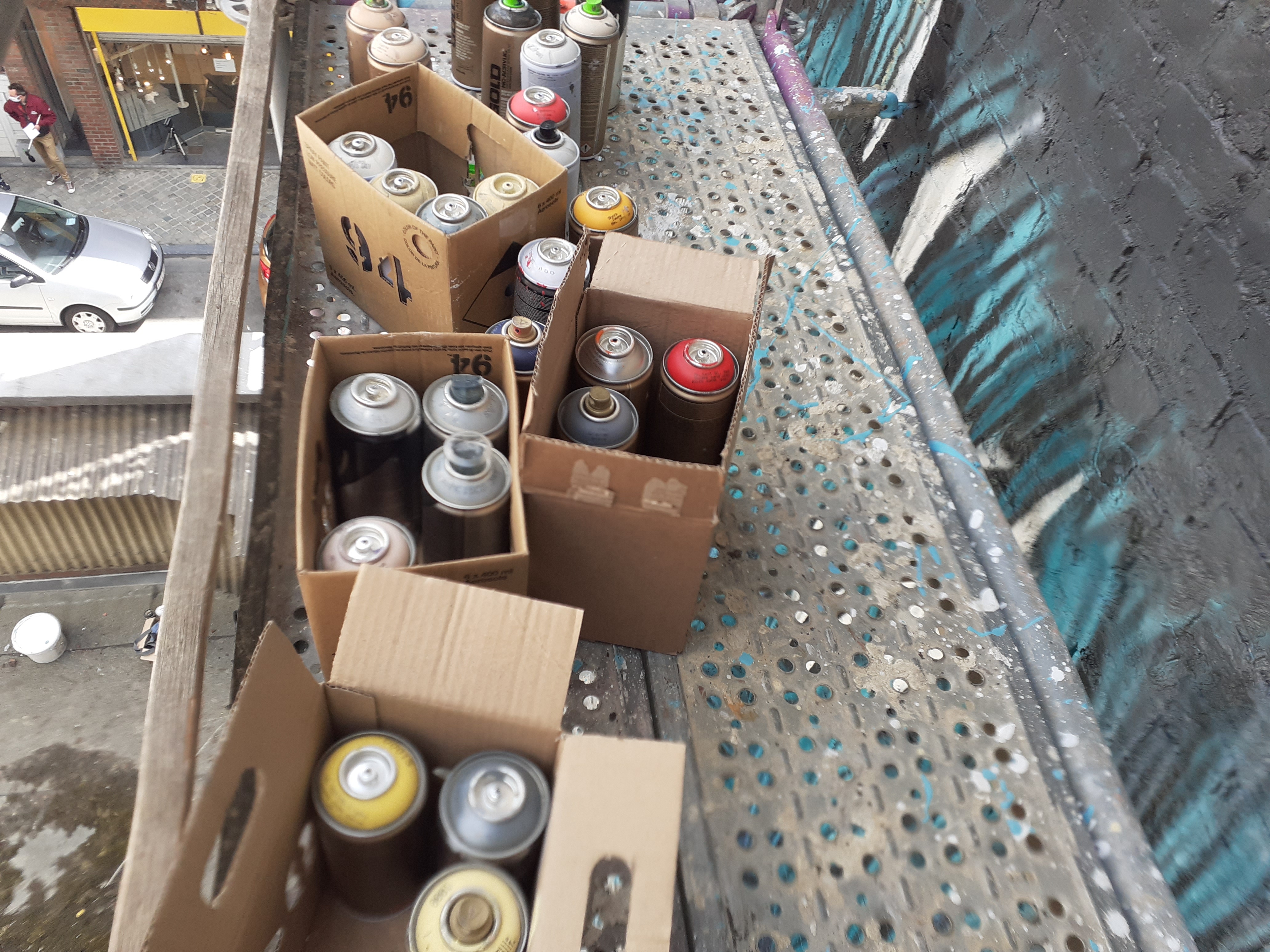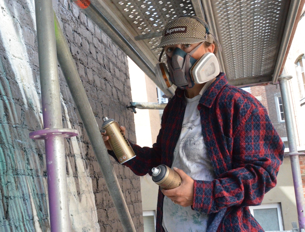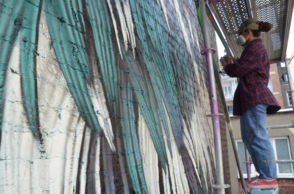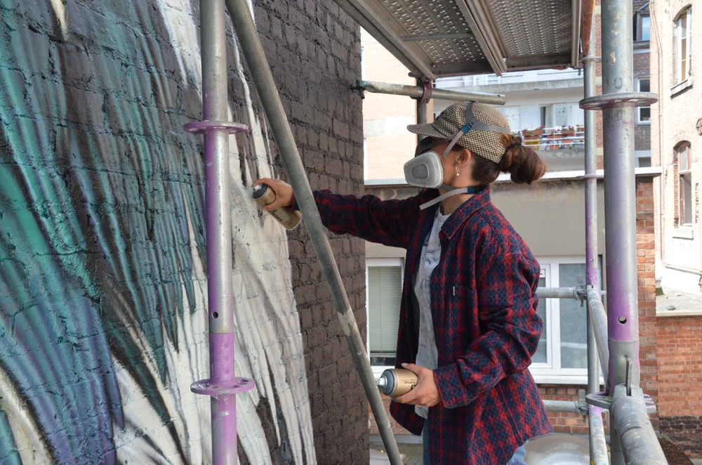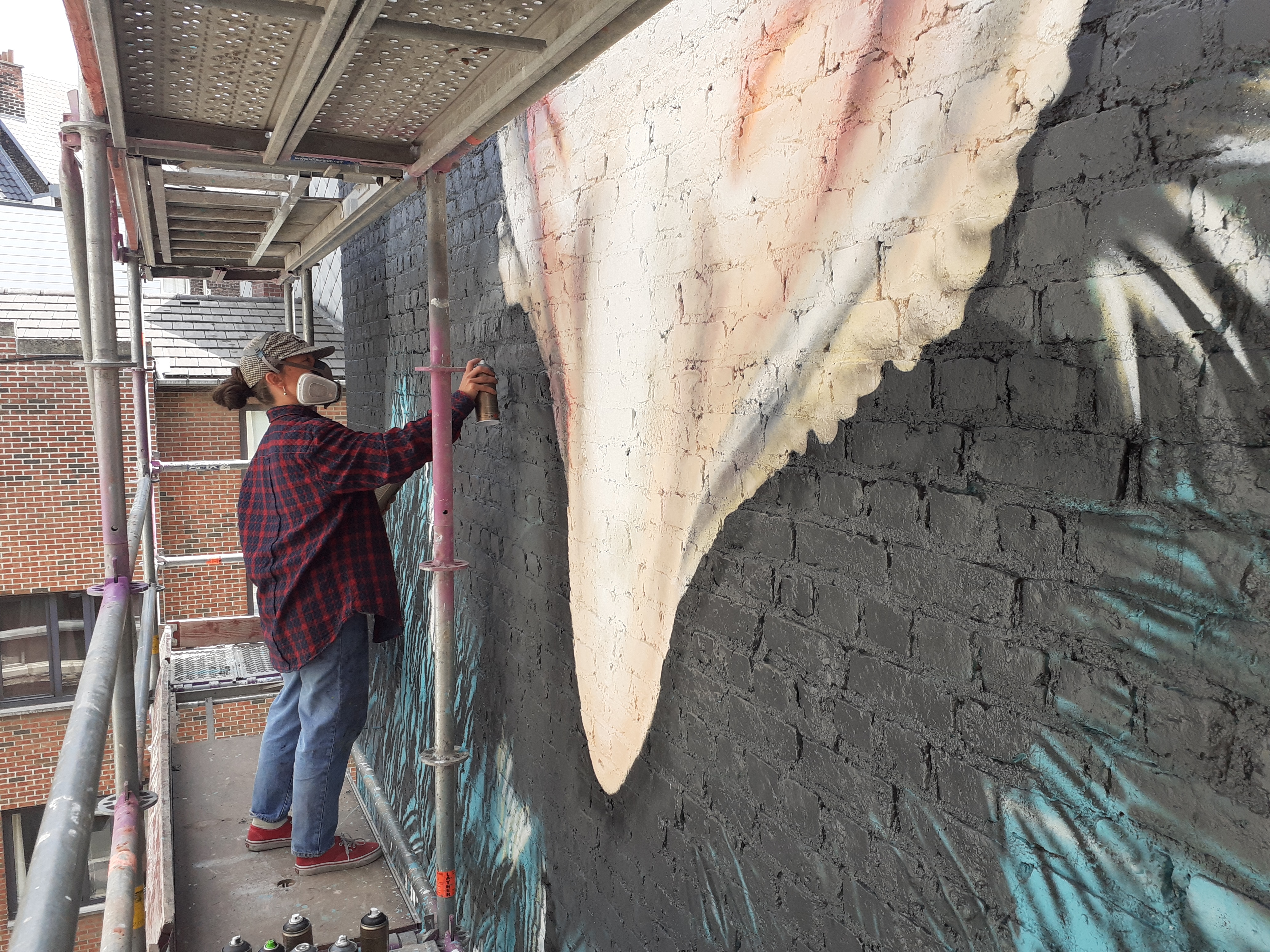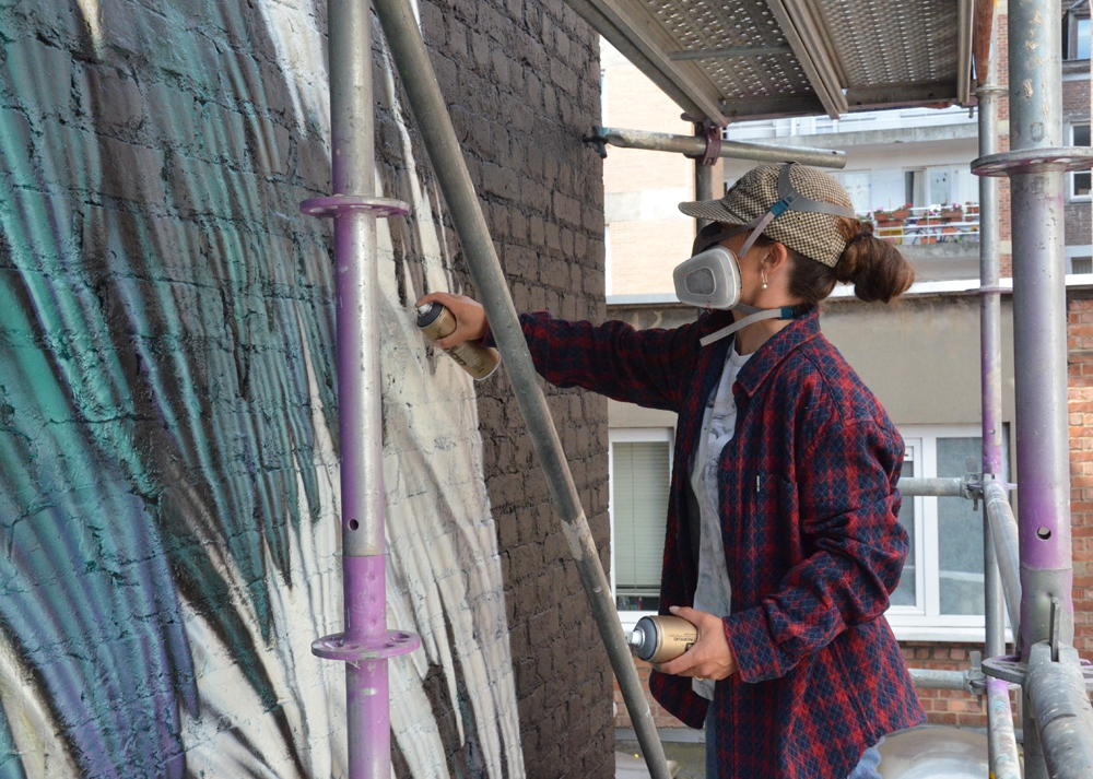L’artiste Adele Renault, artiste liégeoise vivant à Los Angeles termine sa fresque commencée ce dimanche à Liège dans le cadre d’ART PUBLIC LIEGE. Elle peint un pigeon monumental Rue de l’Etuve à Liège.
