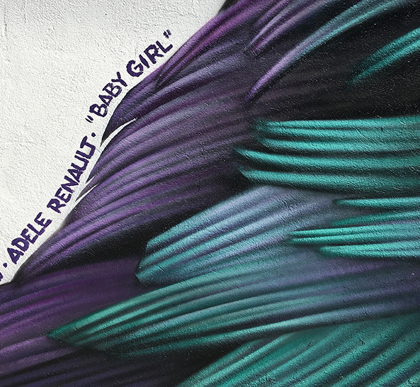 Une remarque s’impose d’emblée : le pigeon peint par Adèle Renault, rue de l’Etuve, n’est pas une pièce de circonstance. Liégeoise d’origine, l’artiste basée à Los Angeles décline ce thème tant dans son œuvre sur toile que dans des peintures murales monumentales. Son travail actualise la tradition du portrait de pigeons remarquables que les colombophiles faisaient réaliser sur commande, une pratique qui disparaît dans les années 1970. Ainsi Adèle Renault peint-elle à Jersey City un immense mur pour rendre hommage à Baby Girl, une « athlète » volante, lauréate d’une course de 600 km remportée avec 19 minutes d’avance sur les autres concurrents. Mais, au-delà de toute anecdote, il y a la virtuosité de la manière, en particulier le traitement des couleurs et leurs effets irisés. Il y a aussi cette façon bien particulière de manifester la présence d’une créature banale, souvent négligée. Les pigeons d’Adèle Renault avec leurs yeux ronds à l’iris hypersaturé et leur posture quasi majestueuse ont une présence qui interpelle et rappellent la beauté qu’on oublie de reconnaître dans les choses du quotidien.