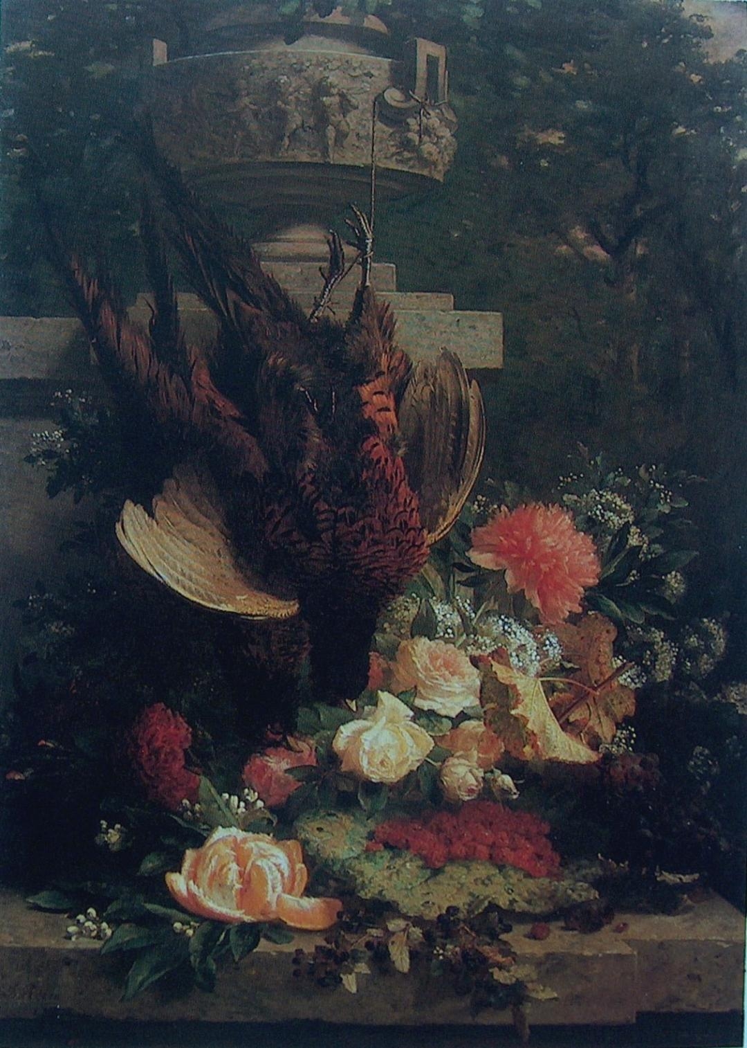 Arrivés au 1er étage, sur le palier, nous sommes confrontés à un contraste entre une oeuvre contemporaine de Jacques Charlier (°1939) et deux natures mortes du peintre bruxellois Jean Robie (1821-1910), dont l’oeuvre fut variée, puisque, grand voyageur, reconnu par Léopold II (1835-1909), lui permit de témoigner de la vie d’alors sur l’île de Ceylan (Sri Lanka, depuis 1972) et en Inde, le « Musée Charlier » lui ayant consacré une exposition, en 2013 -2014, dans le cadre d’ « Europalia India », alors que peu après, en 2014, le « Musée provincial Félicien Rops » accueillit quelques-unes de ses peintures exotiques, au sein d’une expo intitulée « En Route ! Sur les Traces des Artistes belges en Voyage ».
