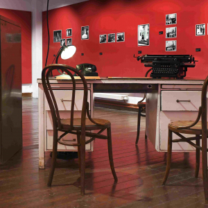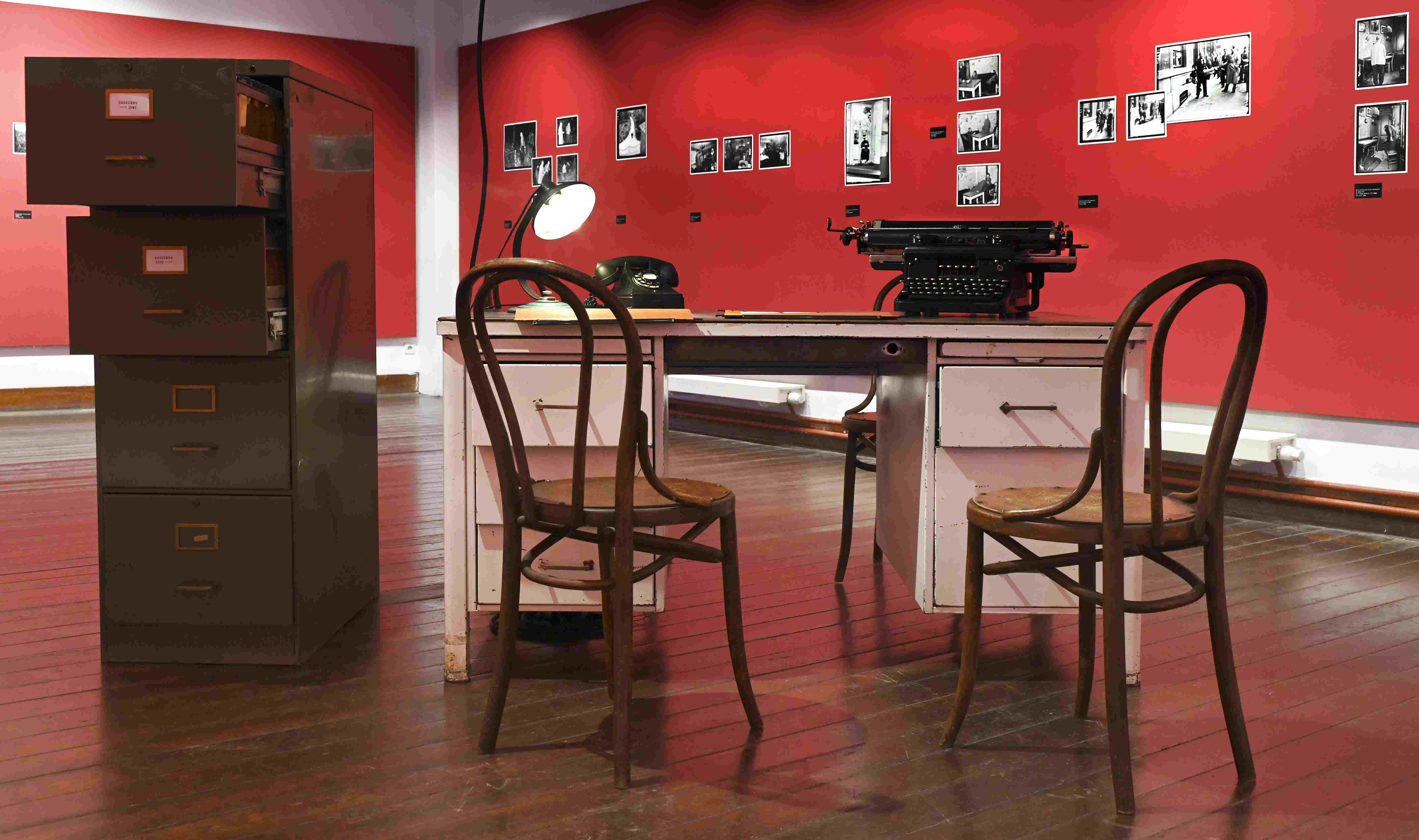 Côté scénographie, notons la présence, au centre de la salle, d’un authentique bureau en bois, avec son ancien téléphone fixe & ses divers documents, tel qu’on les trouvaient, autrefois, dans un commissariat de police, là où un agent était prêt à attendre nos dépositions.