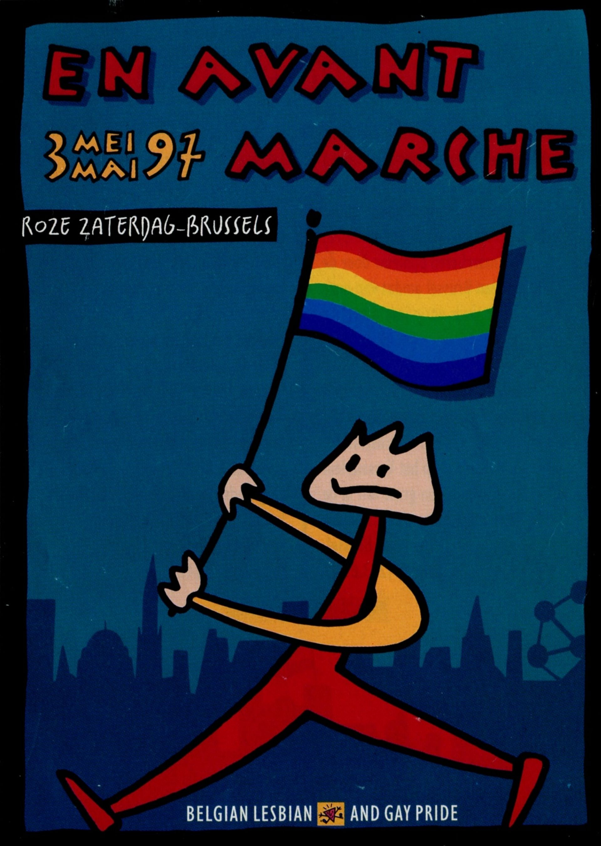 Dès les années ’50, les communautés LGBTQI+, à Bruxelles, utilisent le graphisme et développent un langage spécifique. Cette grammaire visuelle signale leur présence et leurs engagements envers un ensemble de principes, d’identités et de valeurs partagés.