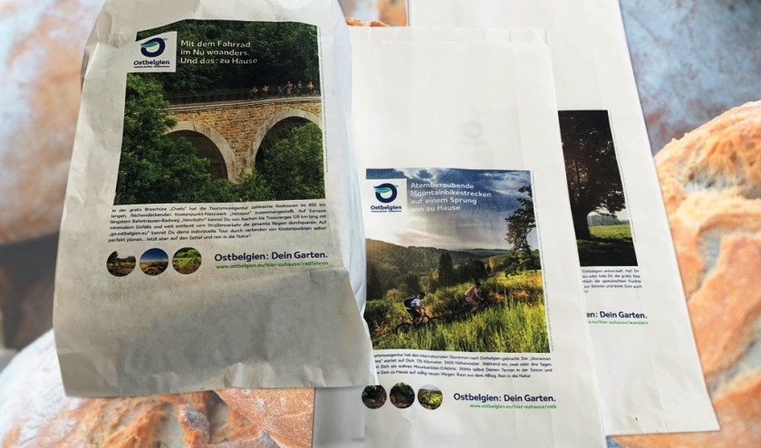 L’Agence du Tourisme des Cantons de l’Est a dès lors décidé de mener une campagne d’information qui s’adresse tout particulièrement aux habitants de la région. « Grâce à cette campagne, la population locale devient ambassadrice de leur région de vacances. C’est à la maison qu’on se sent le mieux et les environs réservent même au plus habitué encore pas mal de surprises et de découvertes. Nous invitons tous les habitants des Cantons de l’Est de s’approprier « leur jardin », poursuit Sandra De Taeye. Un code QR renvoie vers le site www.ostbelgien.eu qui présente les produits phare de la région, à savoir la randonnée et le cyclisme. Ce lien permet en outre de découvrir l’offre touristique complète, à savoir, les lieux d’excursion, les routes touristiques et autres conseils de voyages. Le concept a été développé par créateur de marque Christoph Heinen (1A, Malmedy). Les sachets de pains ont été distribués gratuitement dans toutes les boulangeries dans les 11 communes des Cantons de l’Est - Amblève, Büllingen, Bütgenbach, Burg Reuland, Eupen, La Calamine , Lontzen, Malmedy, Raeren, Sankt Vith et Waimes - et se retrouvent donc le matin, à midi ou le soir sur de nombreuses tables de la région. Car quasi chaque ménage achète du pain. La campagne se déroule sur une période de trois semaines et a été très bien accueillie par les boulangeries de la région qui ont spontanément accepté d’y participer.