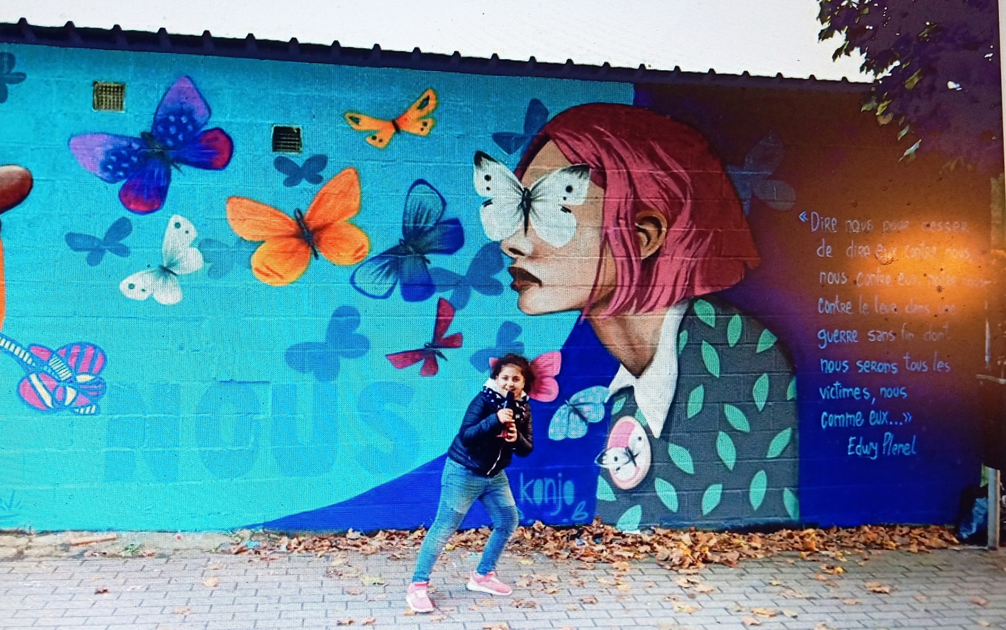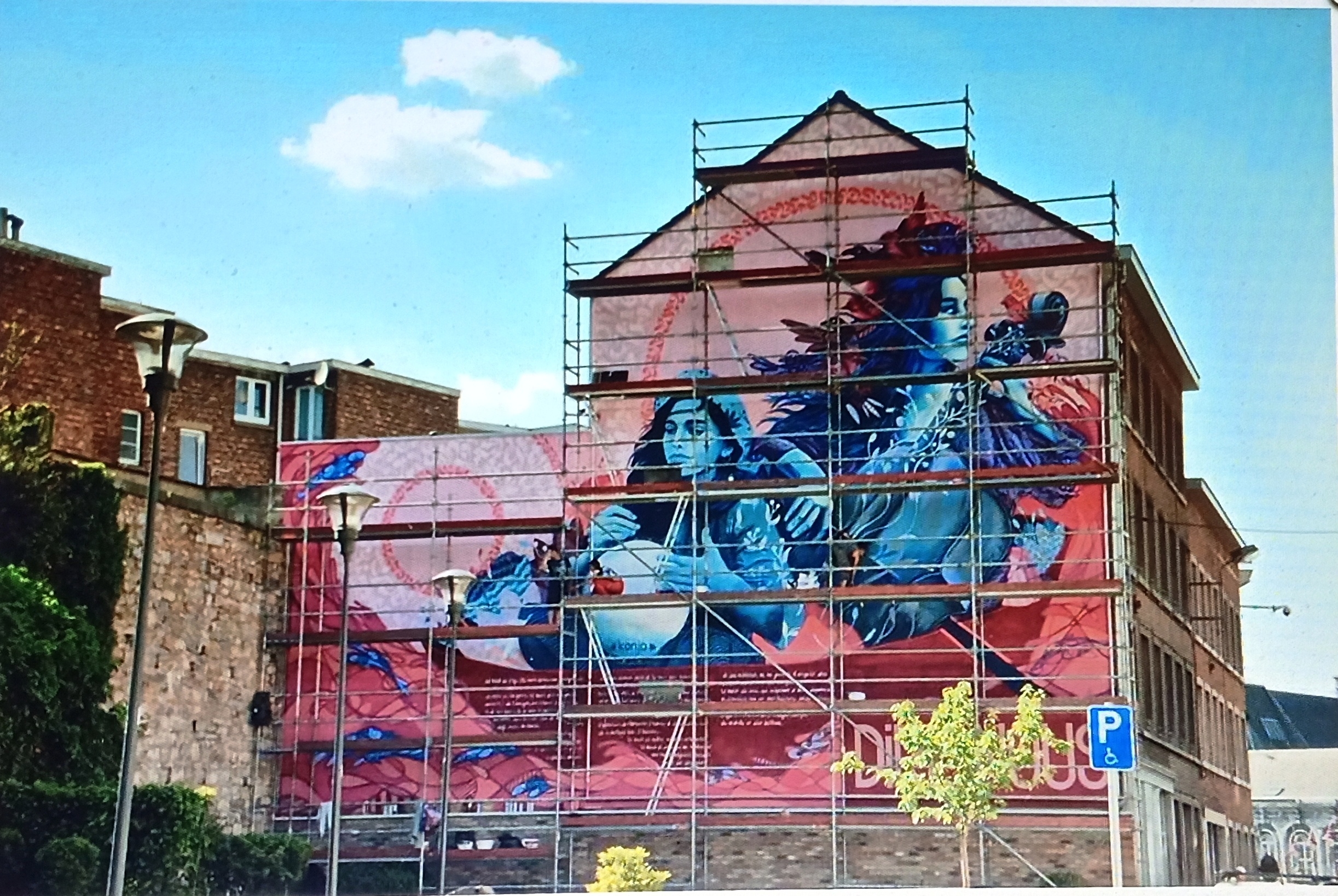 S’en sont suivies les realisations de l’ Enclos des Récollets, du quartier de l’Abattoir, de la rue Spintay, du terrain d’aventures de Hodimont et …ce samedi 17 octobre, une nouvelle fresque « Dire nous » a été inaugurée dans la plaine Lentz en Prés-Javais.