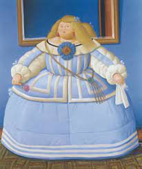« L’Infante Marguerite » (2005), de Fernando Botero, d’après Diego Velázquez (1599-1660) prend une pose similaire à celle du tableau du maître espagnol, mais la large armature de sa robe est le prétexte à développer une monumentalité chère à Botero.