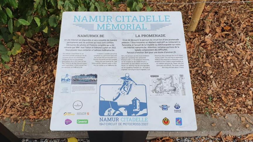 - Ensuite : « Namur Citadelle Mémorial » – inauguré le samedi 30 juillet 2022, à l’occasion du 75è anniversaire du premier motocross de la Citadelle de Namur -, sur la terrasse du restaurant « Le Panorama », jouxtant l’Esplanade de la Citadelle, cette dernière ayant été le cadre de quelques-uns des plus beaux exploits de « Dédé ».