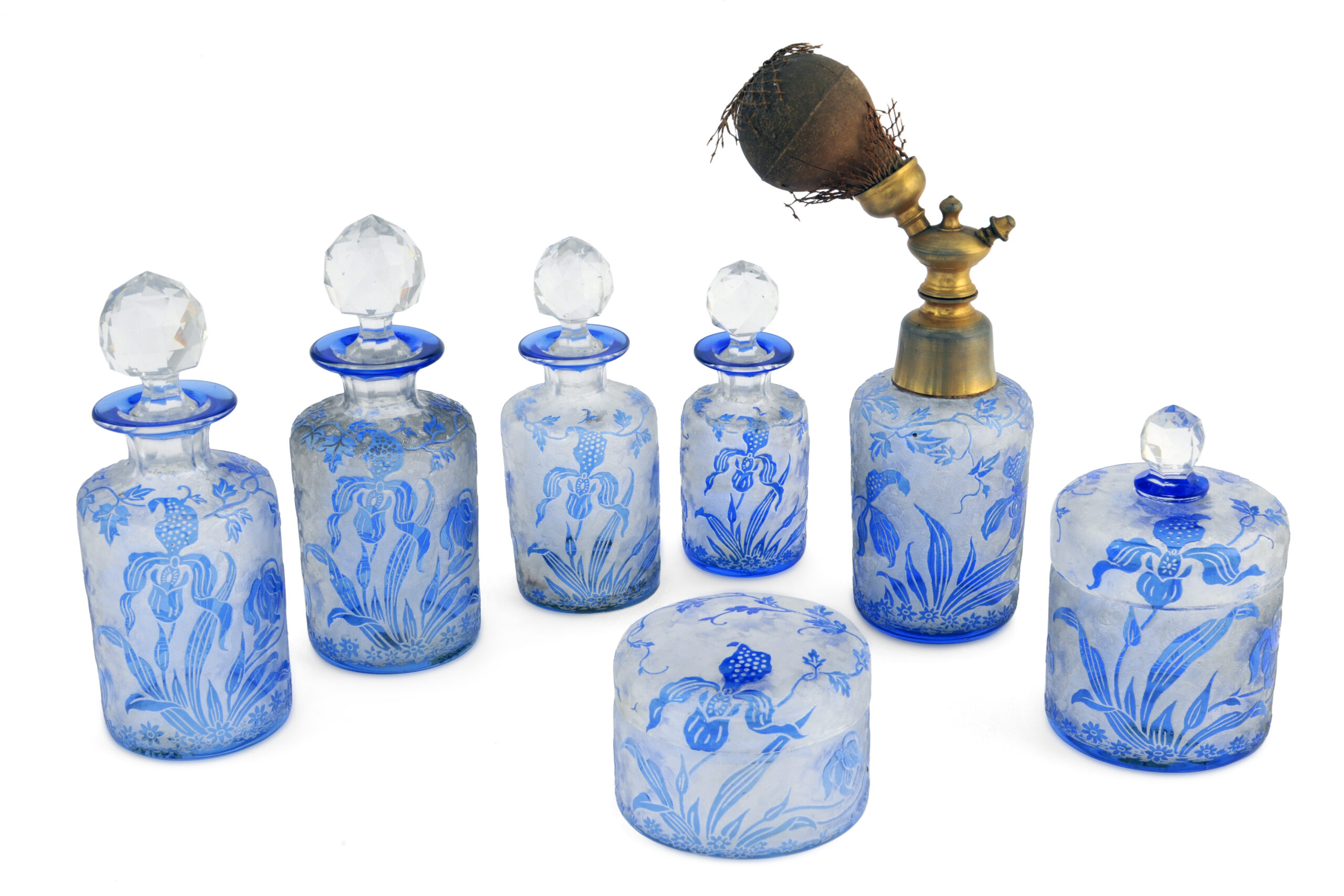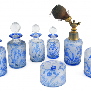 Parmi les coupes, vases et autres créations présenté.e.s, notons les oeuvres de l’artiste liégeois, d’origine parisienne, Léon Ledru (1855-1926) – amateur d’art oriental ou orientalisant, personnalité dynamique, fréquentant les mondes artistiques liégeois et parisien -, qui fait l’objet d’une mise en lumière particulière au sein de cette intéressante exposition, dont sept pièces, intitulées “Orchidées”, une garniture de toilette, réalisée vers 1908, en cristal incolore, doublé bleu et soufflé, avec un décor d’orchidées, gravées à l’acide, sur fond moiré. Parmi ses autres créations exposées, soulignons la présence de son « Vase natal »(1897-1905), qui, repris pour illustrer l’affiche de l’exposition, a été créé en cristal incolore, doublé rose, soufflé, des violettes, gravées à l’acide et à la roue, le décorant.