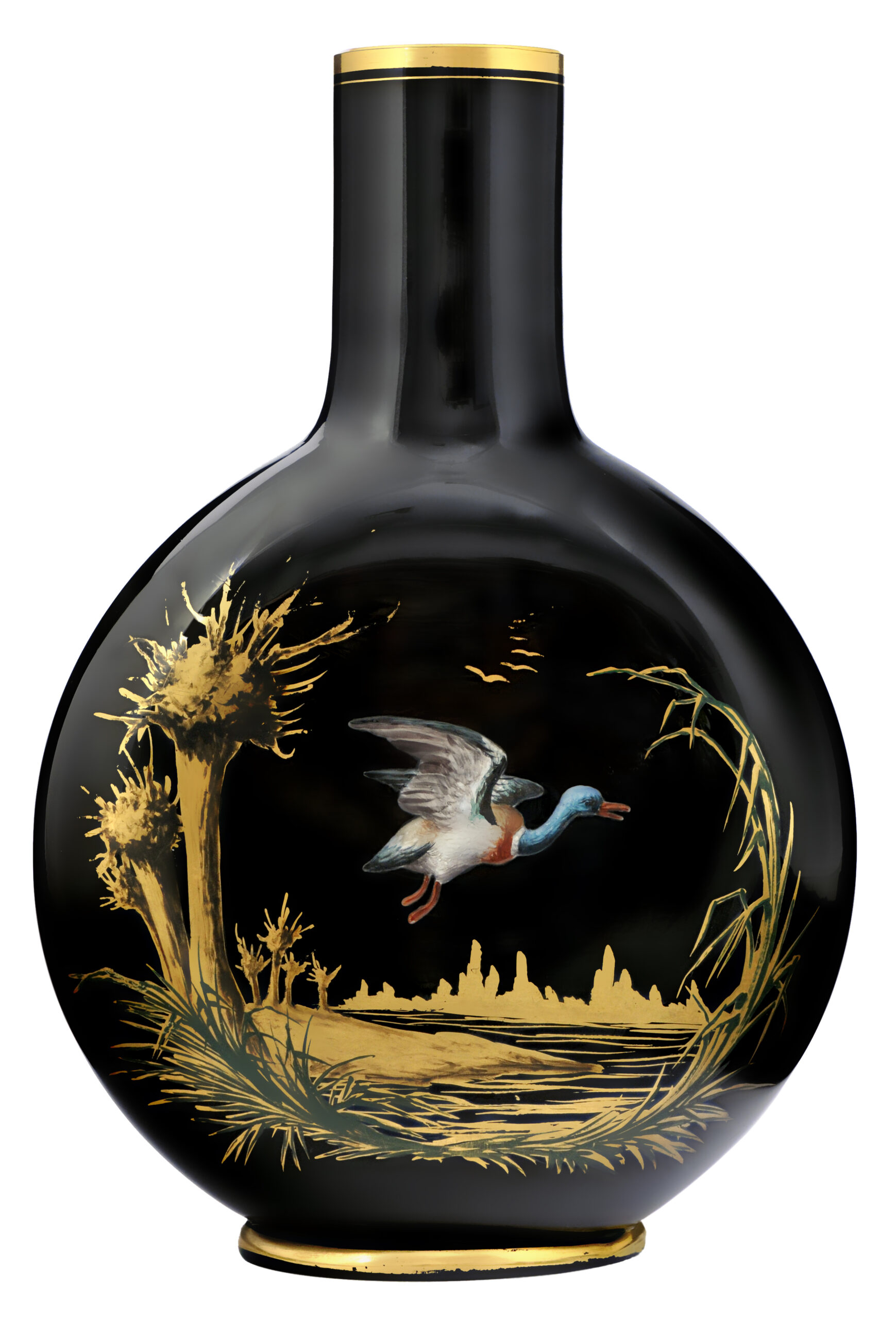 Parmi les oeuvres exposées, témoignant du « Japonisme », notons un joli vase, avec un haut col cylindrique – décoré d’un paysage peint à l’or, surmonté par le vol d’un canard émaillé – réalisé, vers 1880, en verre hyalite, un verre noir opaque soufflé, à l’éclat intense, dont la formule a été mise au point en Bohème.