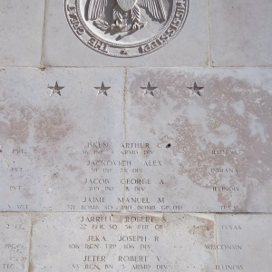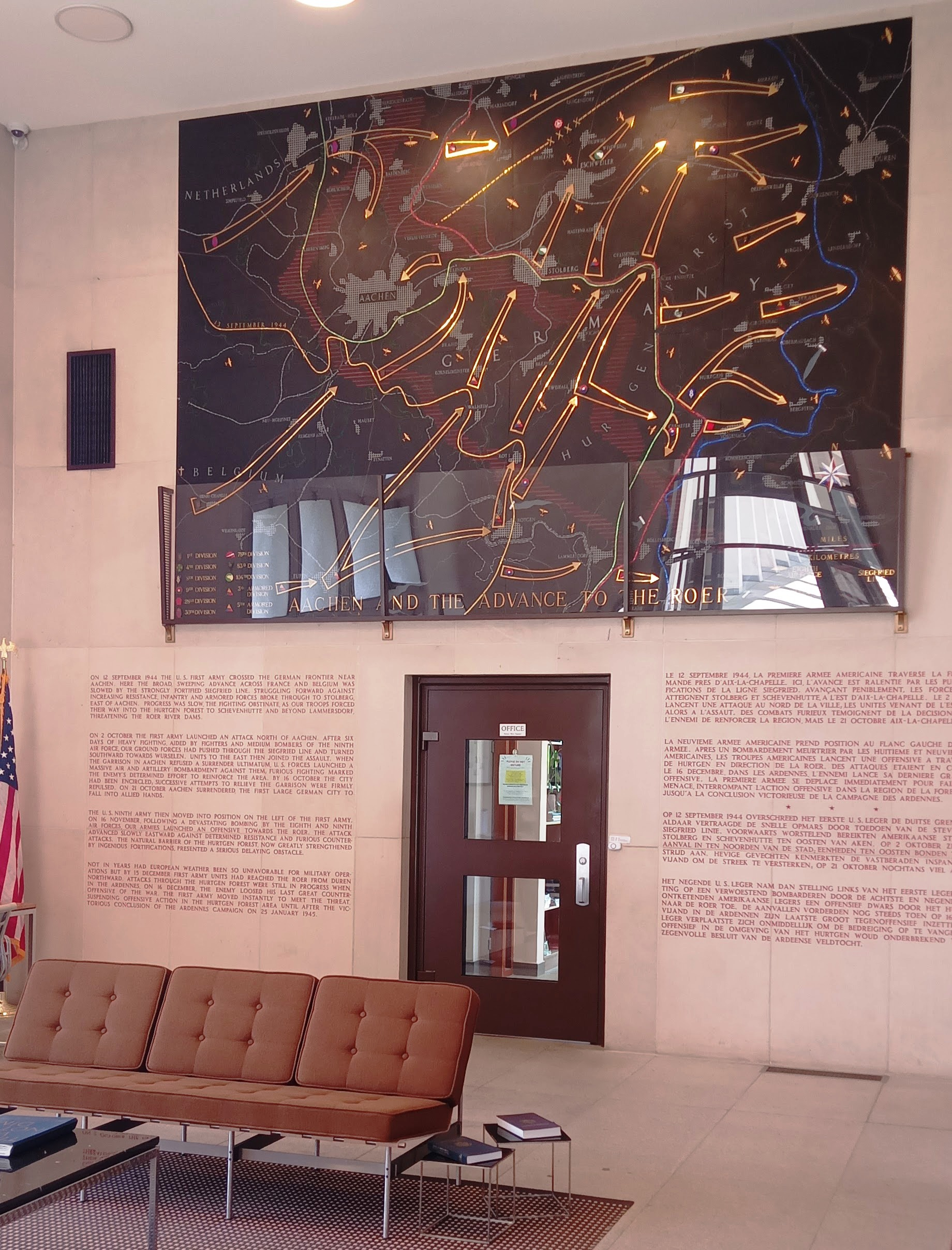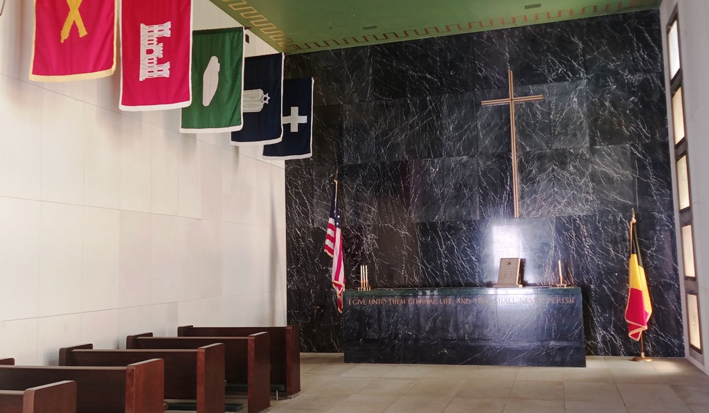 À l'est, une longue colonnade forme, avec la chapelle et la salle des cartes, le mémorial qui domine les sépultures. La chapelle est à la fois simple et joliment ornée. Quant à la salle des cartes, elle contient deux plaques de granite noir sur lesquelles sont gravées des opérations militaires, ainsi que des inscriptions rappelant les exploits des forces américaines. Sur les piliers rectangulaires de la colonnade, figurent les noms de 450 soldats portés disparus. Des rosaces ont été ajoutées pour signaler ceux qui ont été retrouvés et identifiés. Ce cimetière abrite les Américains de deux grandes campagnes : l'avancée de la 1re armée à travers le nord de la France, la Belgique, les Pays-Bas et le Luxembourg pour atteindre l'Allemagne (septembre 1944) ; et la bataille des Ardennes, contre-offensive allemande dans la région du même nom (de décembre 1944 à janvier 1945).