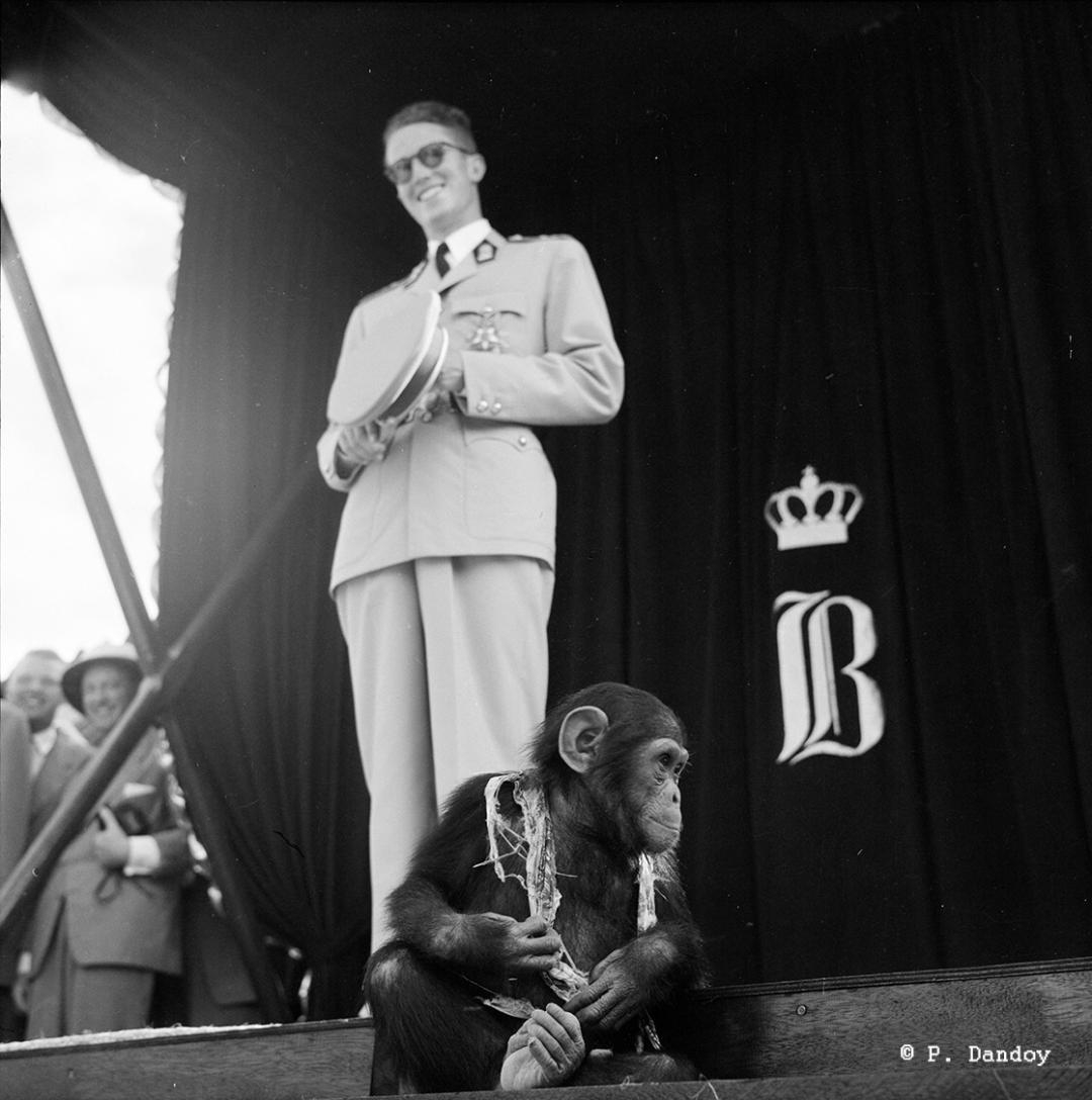 S'étant procuré les meilleurs appareils de l'époque, tels "Rolleiflex", "Hasselblad", "Nikon" & "Nikkormat", devenu sergent, il accompagna, en 1955, un chercheur de l' "Institut des Sciences Naturelles", lors d'une expédition dans la région congolaise de Banana, rencontrant le Roi Baudouin, ce que nous découvrons au sein de l'exposition de "MusAfrica", Pierre Dandoy, réalisant - aux côtés des photos officielles, prises dans le cadre de son travail - des clichés originaux, telle cette photographie centrée sur un charmant petit singe, avec le Roi Baudouin en arrière plan, ou encore, au sein du public, applaudissant le Roi, un enfant regardant directement le photographe.