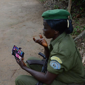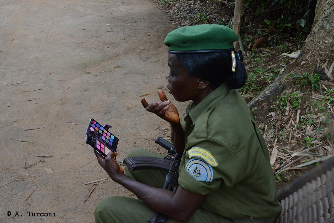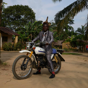 Parmi ses clichés, notons ce chef d'un village Pende, photographié chez lui, en 2017, dans une mise-en-scène conçue par lui, avec ses attributs traditionnels, mais aussi des références plus modernes. Autre chef, Mongo, quant à lui, se voulant moderne, il est photographié, en 2017, dans son Village de Monkoto, en costume occidental, trônant sur une moto, avec, en contraste, ses attributs coutumiers. Portrait plus simple, cette gardienne d'un Parc national prenant le temps de se maquiller pendant son service.