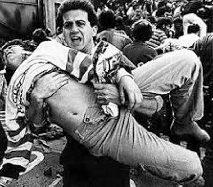 Au Stade du Heysel à Bruxelles, des grilles de séparation et un muret s'effondrent sous la pression et le poids de supporters italiens, acculés par les hooligans anglais. Le bilan est tragique: 39 morts et plus de 450 blessés.