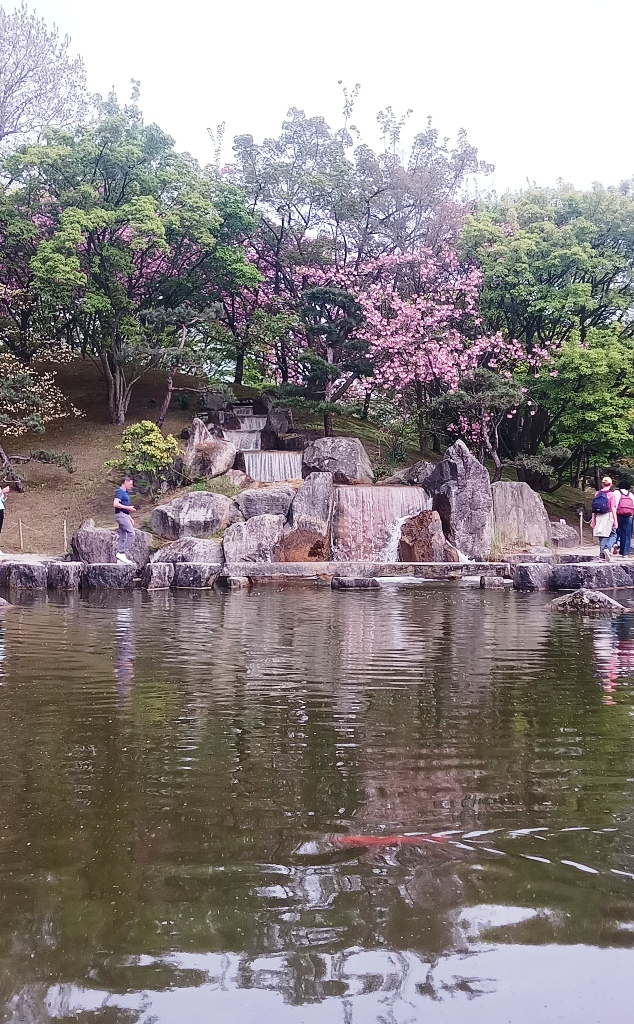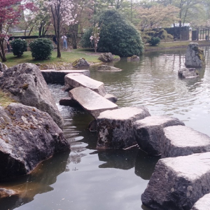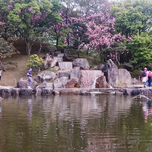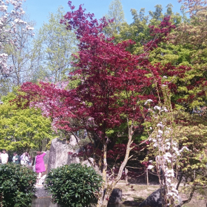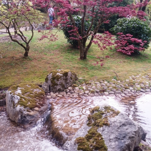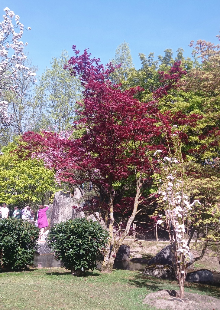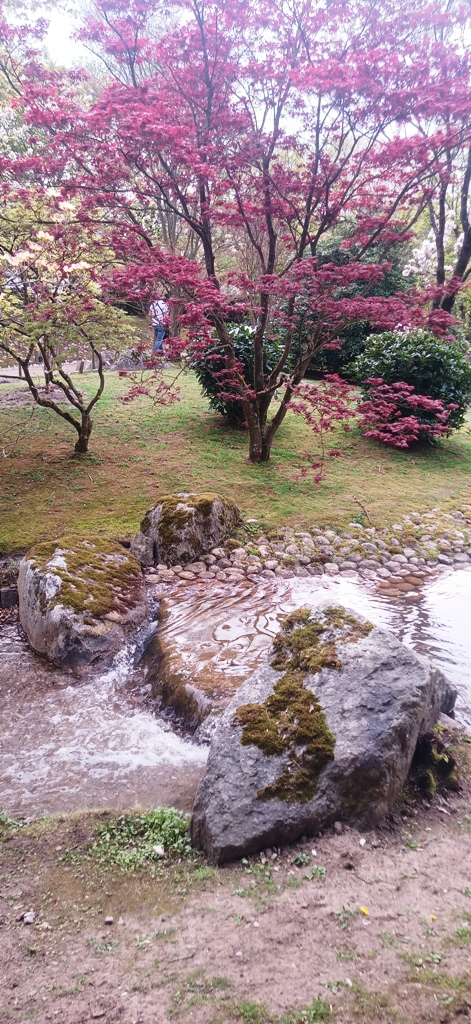 - La deuxième partie est le jardin japonais central et authentique. On y trouve la cascade de la porte du dragon avec ses pierres à traverser, les pins iconiques taillés à la japonaise et les érables japonais aux couleurs automnales prononcées.