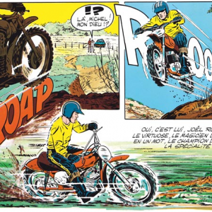 Que cette parade ne nous fasse pas oublier l'exposition, à la "Bourse", ouverte, gratuitement, jusqu'au dimanche 31 juillet, de 11h à 17h. Outre 25 motos exposées, dont dix de cross, nous y bénéficions, également, de projections, sur deux écrans, de films et diapositives retraçant les grands moments de ce Motocross de la Citadelle, des photos étant exposées, alors que, dans des vitrines, nous retrouvons différents souvenirs, de diverses médailles à des timbres-poste belges, en passant par une bande dessinée - "Rodéo sur 2 Roues" (Ed. "Dargaud"/1971) - de Michel Vaillant, créée par l'auteur français Jean Graton (1923-2021), mettant Joël Robert et le motocross à l'honneur.