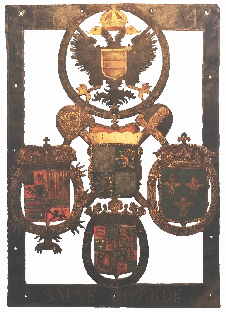 De la fin du 16e au milieu du 18e siècle, les sauvegardes furent des documents officiels quémandés par les édilités communales de Spa aux principaux souverains d’Europe qui interdisaient à leurs troupes d’entrer dans le bourg et d’y commettre les déprédations habituelles d’une époque où les armées n’avaient pas de solde et se payaient sur l’habitant. Dans la seconde édition des « Amusemens de Spa » de Jean-Philippe de Limbourg, on trouve la description de cette sauvegarde : « Il y avoit ci-devant, au coin de l’ancienne Maison de ville, un assemblage d’Ecussons, disposés en forme de Croix ; en haut, c’étoient les Armes Impériales ; au bas celles d’Angleterre ; au milieu celles de Bavière ; & aux deux côtés celles de France & d’Espagne ; avec la date de l’an 1674 ». Reprenons dans l’ordre ces différents blasons. En tête, on reconnaît l’aigle bicéphale du Saint-Empire germanique avec, en son centre, l’écu des Habsbourg. A gauche, dans la partie centrale, sont reproduites les armoiries de la Maison d’Espagne entourées du collier de la Toison d’or, tandis qu’à droite on distingue le très reconnaissable écu fleurdelisé de la France. Au centre, il s’agit des armes de Maximilien Henri de Bavière qui régna sur la Principauté de Liège de 1650 à 1688. Les princes-évêques avaient une double fonction, temporelle et spirituelle, symbolisée ( ici, comme au fronton du palais des princes-évêques à Liège ) par la crosse et l’épée croisées derrière l’écu. Le registre inférieur est occupé par les armoiries d’Angleterre entourées de la célèbre devise d’Edouard III « Honni soit qui mal y pense », devenue celle de l’ordre de la Jarretière.
