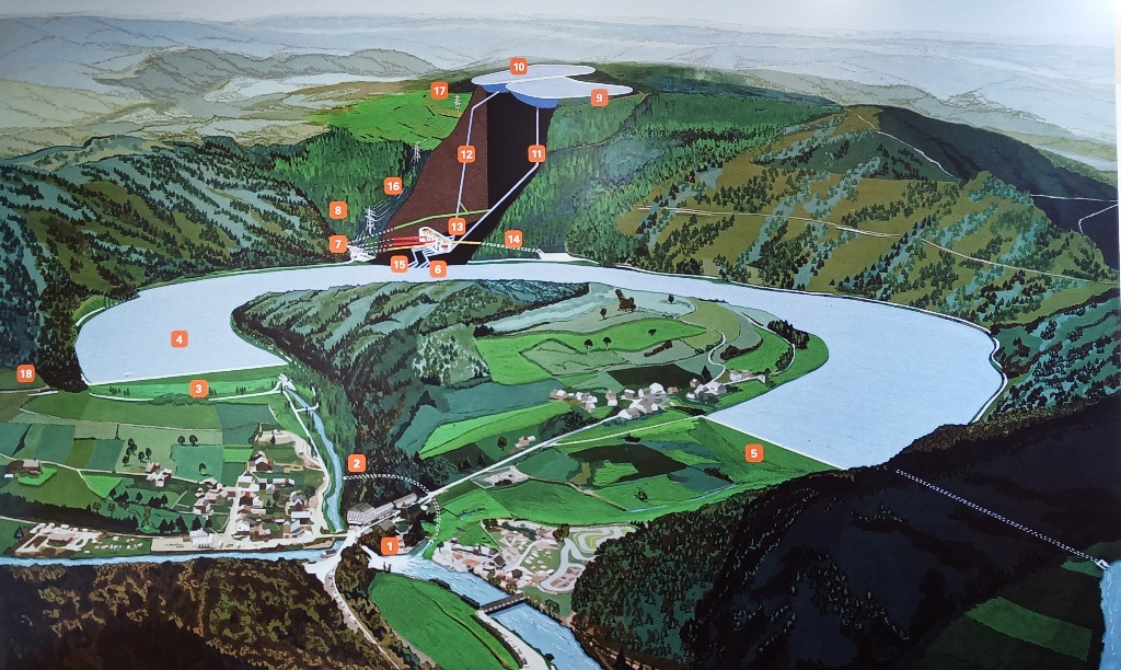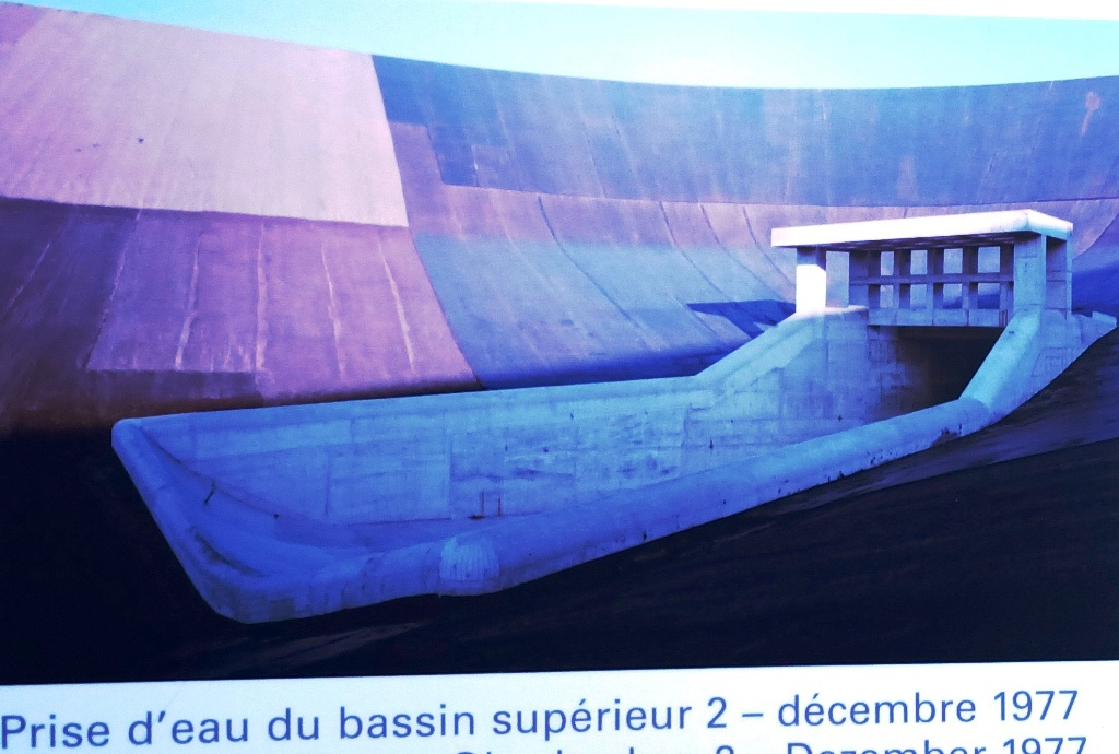 Une galerie de vidange relie le bassin inférieur à la rivière et peut être utilisée lorsque le lac inférieur doit être vidé. 2 bassins supérieurs ( lacs artificiels ) ont été créés sur la colline ( Mont St Victor ) par l’excavation de millions de mètres cubes de roches et de terre. Chaque bassin supérieur est équipé de sa propre conduite forcée, le reliant vers le bassin inférieur et présentant un dénivelé naturel de 250 m.