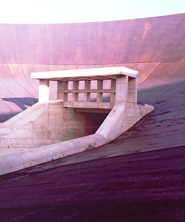 L’eau du premier bassin se déverse d’abord dans un puits vertical au cœur de la colline pour s’échapper ensuite dans un tronçon oblique en direction de la centrale.