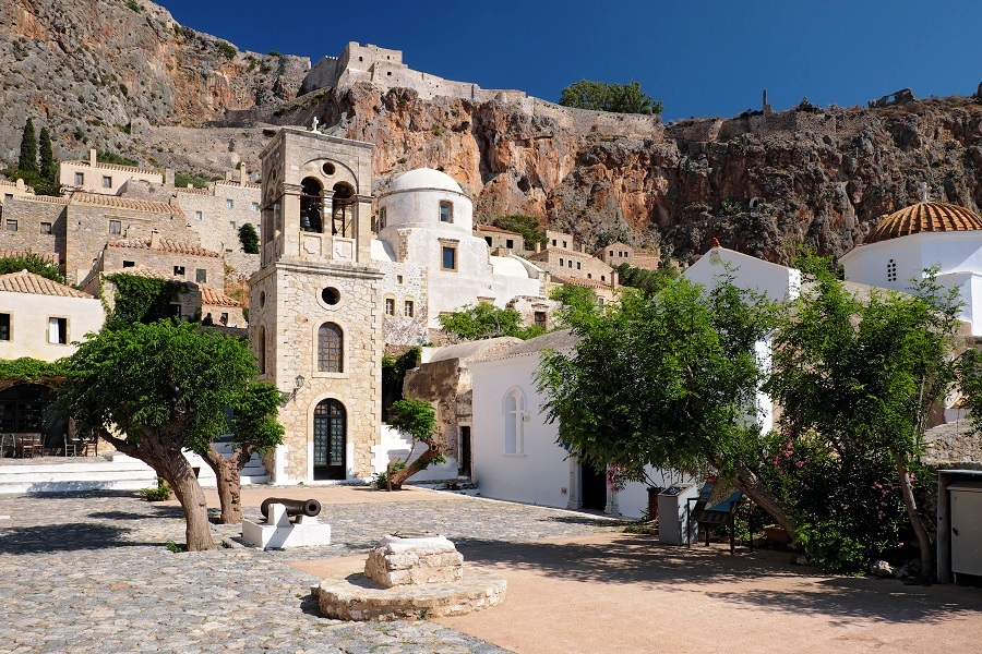 Quand on voit surgir le gigantesque rocher de Monemvasia, on n’imagine guère le joyau qui se cache derrière ce vaisseau de pierre battu par les flots qui le cernent.
