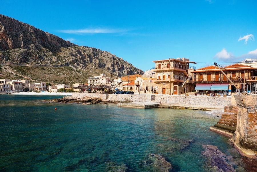 Liméni, Gerolimenas, Porto Kagio, autant de ports minuscules où d’humbles barques colorées dansent sur l’eau et des filets de pêche sont tirés sur la plage de galets. Chaque village se hérisse de hautes maisons carrées dont l’étroite silhouette grise a des allures de sentinelle figée dans la pierre. C’est que les Maniotes sont réputés pour leur caractère farouchement indépendant et leur tempérament guerrier.