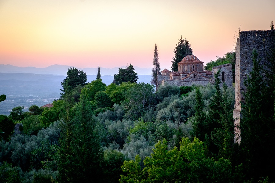 Surmontés par une imposante forteresse franque perchée sur un éperon rocheux, les vestiges de Mystra, l’ancienne capitale byzantine du 14ème siècle, s’étagent sur les flancs d’une colline, offrant un aperçu saisissant d’un empire brisé : dédale de maisons détruites, de palais éventrés et d’églises chapeautées de dômes à l’image de la voûte céleste. Un sentier plus raide débouche au monastère de Pantanassa. Des chats s’étirent au soleil dans une cour fleurie, une nonne vêtue de noir glisse le long des murs sans un regard pour le visiteur. Dans l’église, les murs sont décorés de superbes fresques dont le réalisme s’accentue encore dans la lumière vacillante des chandelles offertes par les visiteurs, troublés par la force de la foi qui habite ces moniales d’un autre temps.