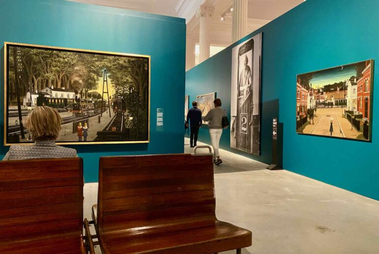 Autres originalités de la scénographie, la présence de nombreux portraits muraux, de grands formats, du peintre ; la reconstitution de son atelier de Watermael-Boitsfort ; la présence de banquettes en bois d’anciens trains, qui nous permettent de prendre mieux le temps d’admirer les oeuvres exposées ; sans oublier, celle de son képi noir et rouge, avec liseré doré, de chef de gare honoraire de la gare de Louvain-la-Neuve, qui lui fut remis, photo à l’appui, par le ministre belge des Transports, Herman De Croo (°Opbrakel/1937).
