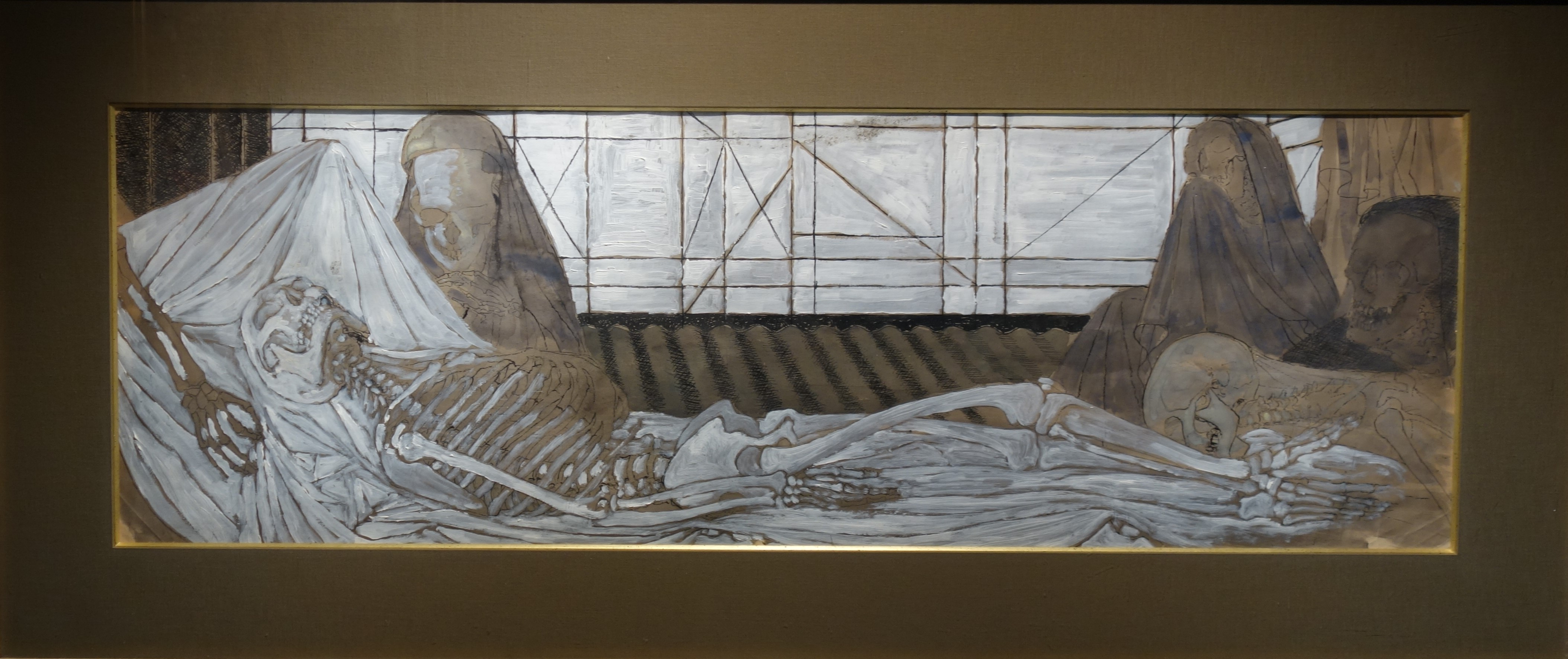 Notons la présence, dans « La Venus endormie », d’un squelette, Paul Delvaux donnant vie, comme le fit James Ensor, à des squelettes, dans de nombreuses peintures, comme s’il s’agissait d’êtres en chair, lui qui avait été fasciné, dans la classe de biologie de son école primaire, par un squelette qui y était exposé, le squelette qu’il possédait, dans son atelier de Watermael-Boitsfort nous étant, aussi, présenté à « La Boverie ».