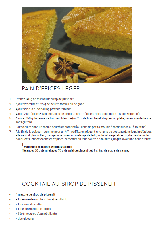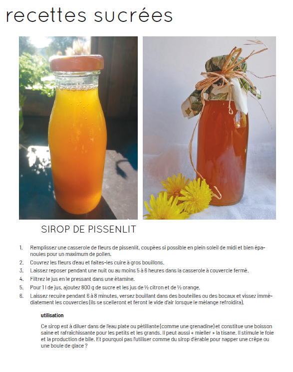 Au programme ? Smoothie doux aux orties, cocktail au sirop de pissenlit, vin de sauge ou de menthe, beignets apéro de plantain, tisane gaufre pomme-cannelle, pâté aux noisettes, confiture de châtaigne... Au-delà du gustatif, les vertus alimentaires et médicinales des plantes sauvages sont au centre du livre : de l'huile de pâquerette pour raffermir la peau au sirop de lavande et coquelicot pour apaiser et faciliter