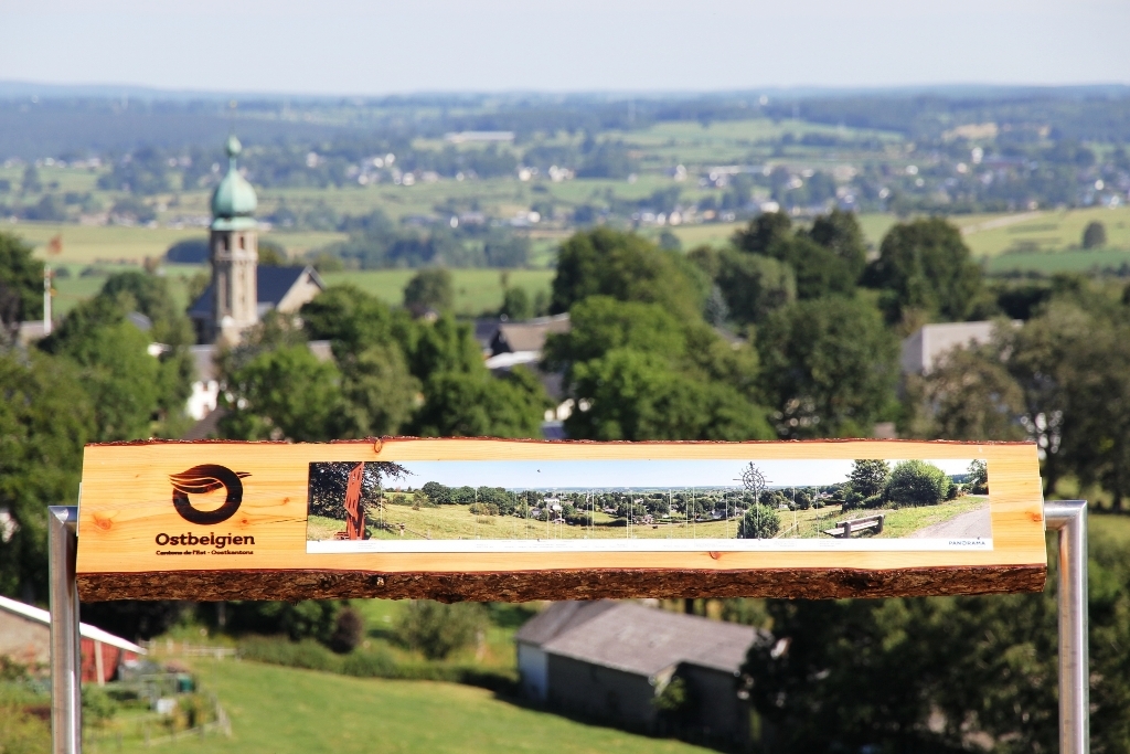 Il fallait donc trouver un design uniforme propre aux produits touristiques des Cantons de l’Est, à savoir « Bienvenue dans le surprenant jardin de l’Europe ». Cette devise détermine depuis deux ans les produits touristiques dans les Cantons de l’Est. Les panneaux sont constitués d’une planche orientable en bois massif en mélèze indigène qui est maintenue par deux piquets métalliques. La face avant arbore le O de « Ostbelgien » en marquage à chaud ainsi que la photo panoramique avec les références numériques reprises sur une plaque résistante aux intempéries. Le verso présente des informations sur les lieux référencés.