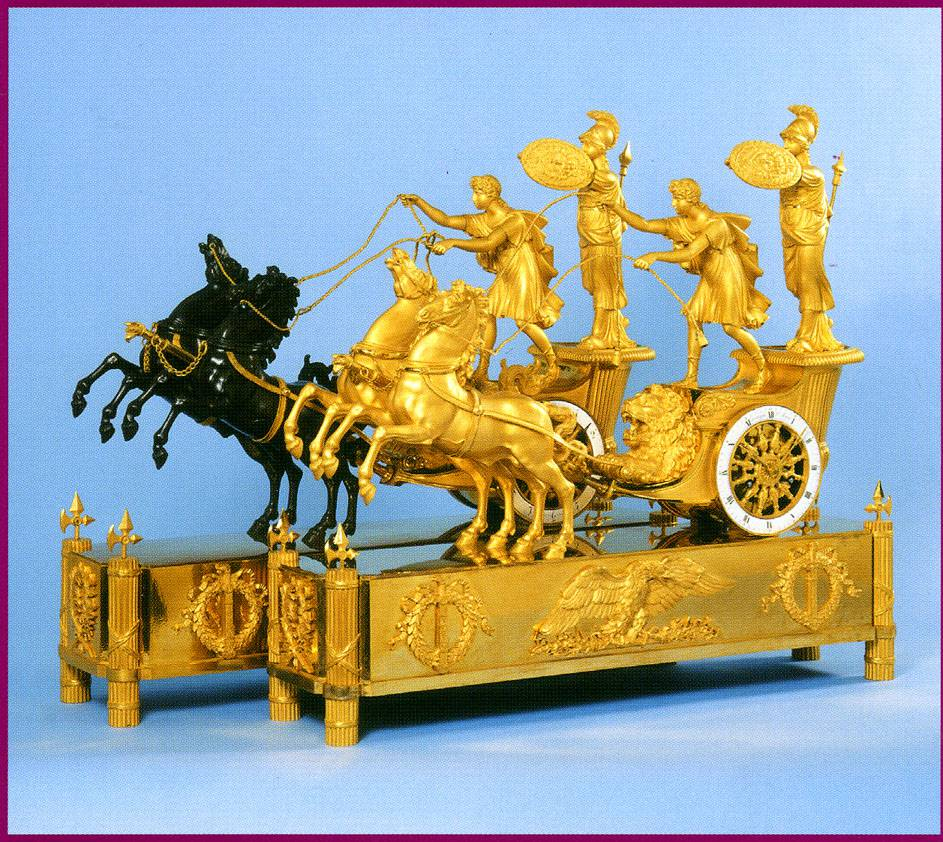 2- La « Pendule au Rémouleur », par le bronzier parisien Pierre-Philippe Thomire (1751-1843) et l’horloger « Gavelle l’Ainé » (Pierre Gavalle/1753-1802). Créée en marbre « vert de mer », d’époque Directoire, cette pendule automate, à guichet et cadrans tournant, possédant une boite à musique, avec douze mélodies, sa seule réplique connue, réalisée en marbre blanc, se trouvant au « Musée de l’Ermitage », à Saint-Petersbourg.