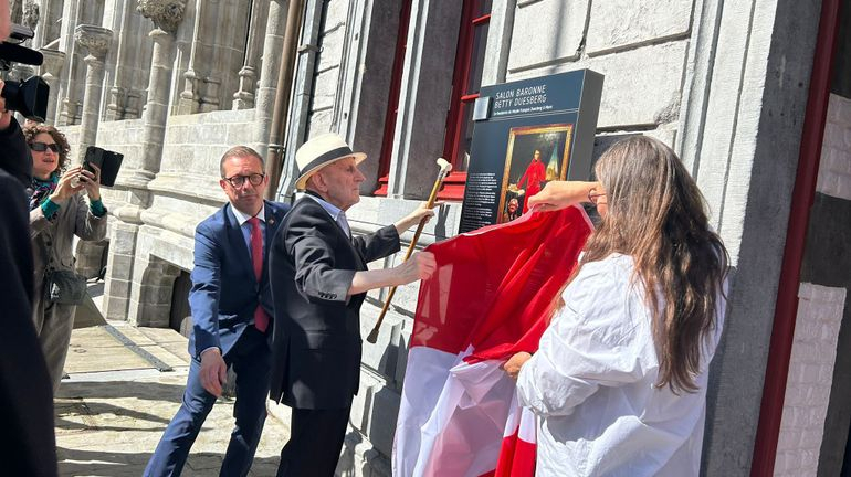 Arrivant, sous les applaudissements, devant la façade du « Salon Betty Duesberg », le baron Elie-François Duisberg fut invité à dévoiler, lui-même, la plaque commémorative, dédiée à son épouse, posée sur la façade de la « Maison de la Toison d’Or », ainsi nommée vu la présence, sur cette même façade, de trois blasons décorés de la « Toison d’0r », ceux des familles Bucquoy de Longueval, de Ligne et de Croÿ.