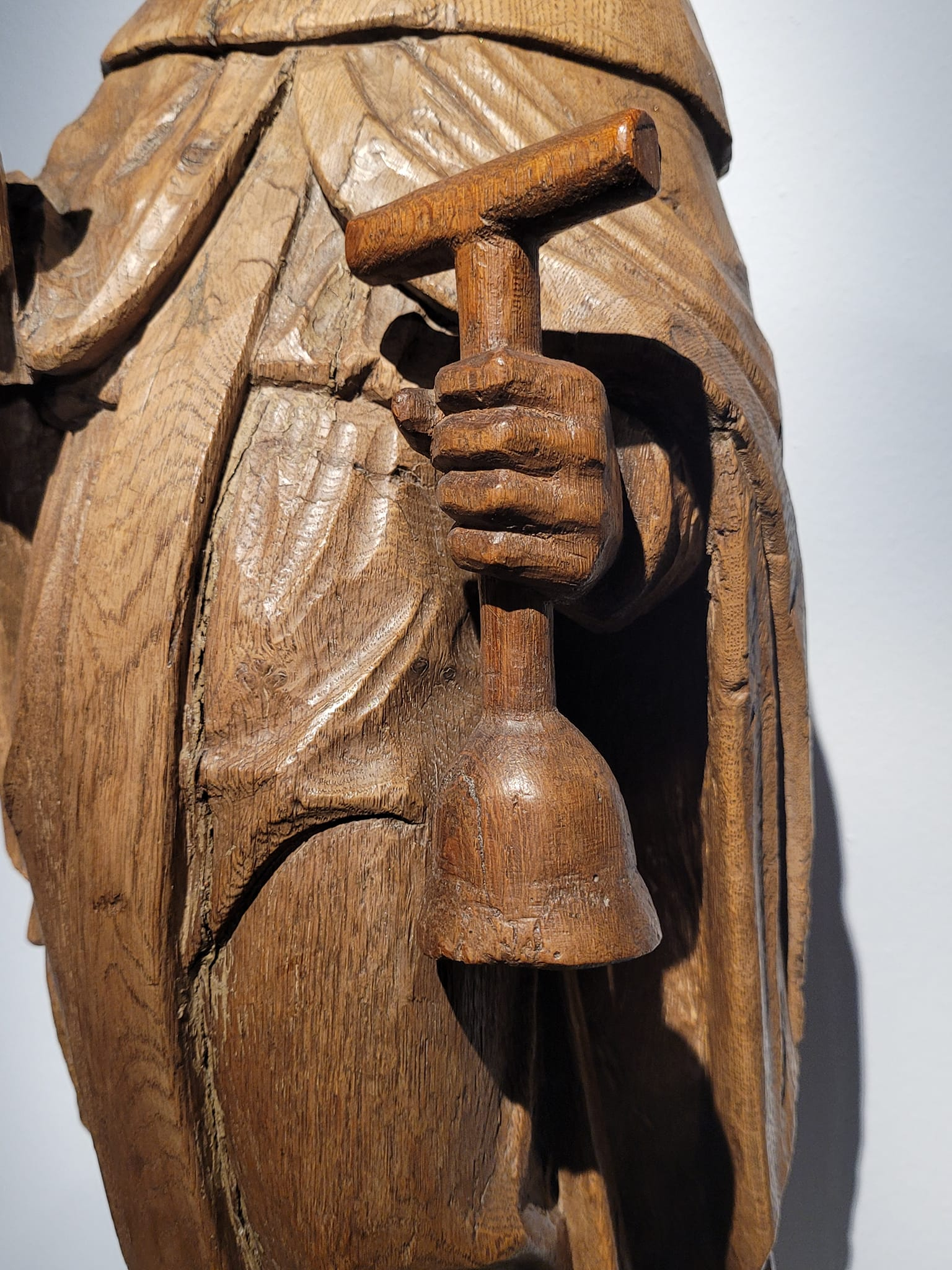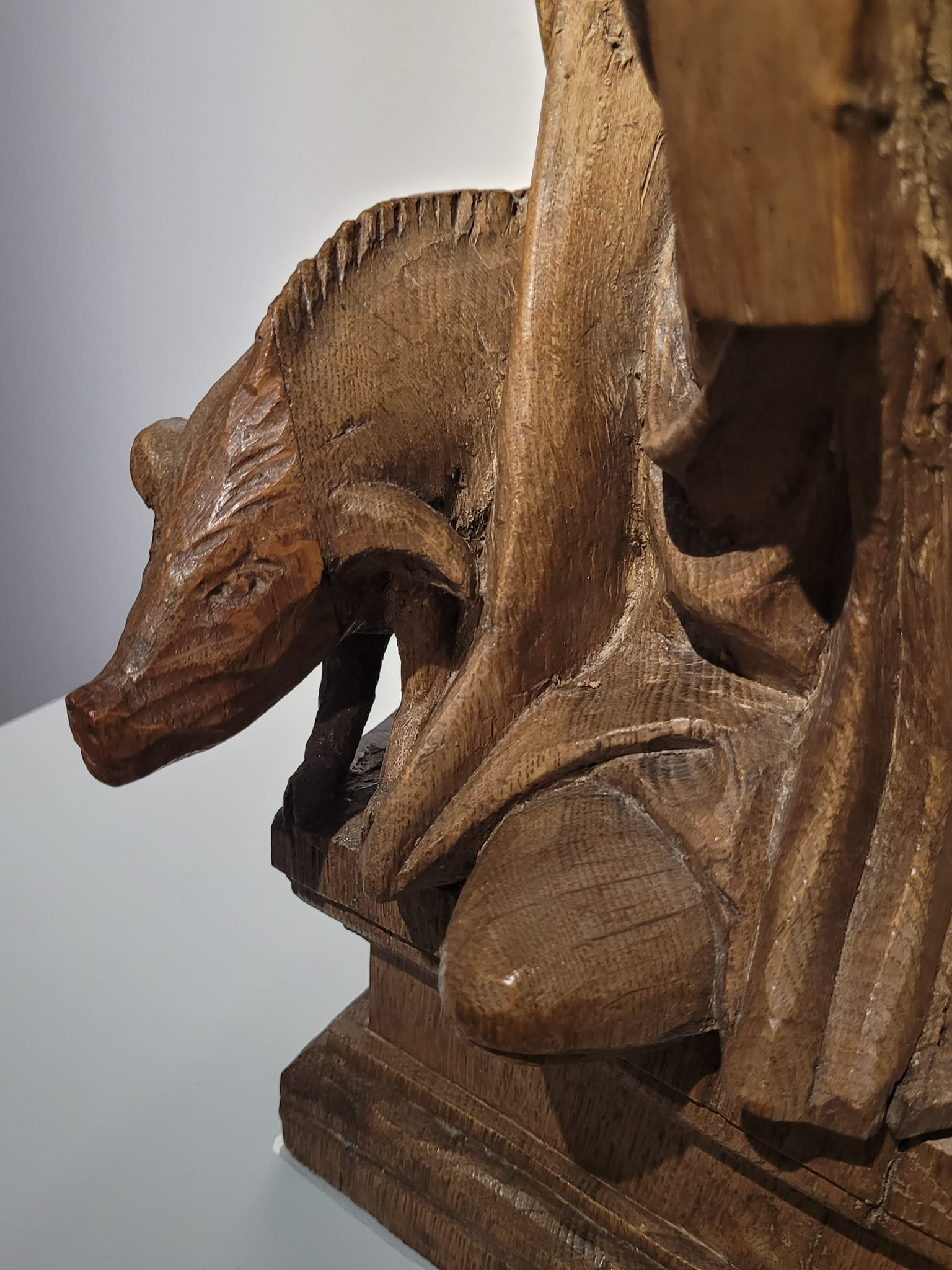 Notre excellent guide, Pierre Bastin, nous donna quelques importantes précisions sur la polychromie et la conservation des sculptures en bois de chêne. Ce concernant, il nous explique que les oeuvres présentant des fentes, plus ou moins profondes, sont la conséquence d'un bois qui n'avait pas suffisamment séché, après avoir été sculpté.